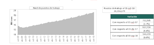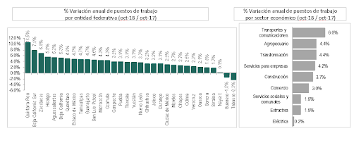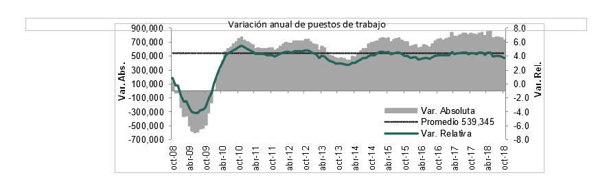 La creación de empleo en lo que va de 2018, enero-octubre, es de 937,724 puestos. Esta creación es 260,794 o 38.5% mayor que el promedio de periodos iguales de los 10 años previos (676,930). Este es el segundo mayor aumento durante el periodo enero-octubre en los últimos 20 años.