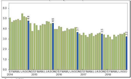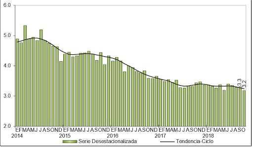 - En su comparación anual, la tasa de desocupación disminuyó en octubre de 2018 frente a la de igual mes de 2017 (3.2% vs 3.4%)