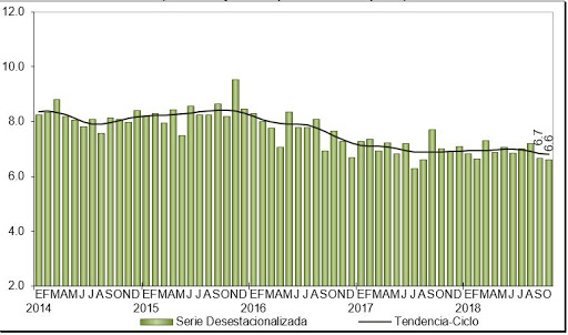 Tasa de desocupación nacional a octubre de 2018. Series desestacionalizada y de tendencia-ciclo (Porcentaje de la PEA)