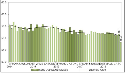 Tasa de ocupación en el sector informal 1 a octubre de 2018 .Series desestacionalizada y de tendencia-ciclo. (Porcentaje de la población ocupada)