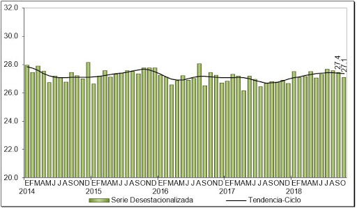 Tasa de subocupación a octubre de 2018. Series desestacionalizada y de tendencia-ciclo. (Porcentaje de la población ocupada)