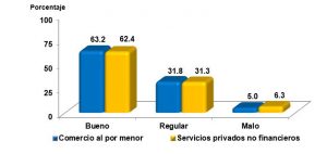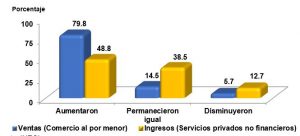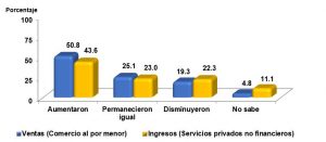 Por su parte, 43.6% de las empresas de los Servicios privados no financieros declaran un aumento en sus ingresos, mientras que 23.0% permanecieron igual y 22.3% disminuyeron.
