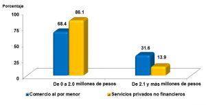 En el Comercio al por menor, 68.4% de las empresas alcanzaron un rango de ingresos de 0 a 2.0 millones de pesos en el Buen Fin 2018, mientras que en este mismo rango se ubicó el 86.1% de las empresas pertenecientes a los Servicios privados no financieros.
