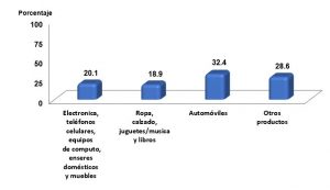 También destaca el grupo de productos de electrónica, teléfonos celulares, equipo de cómputo, enseres domésticos y muebles con 20.1% y finalmente ropa, calzado, juguetes, música y libros con 18.9 por ciento.