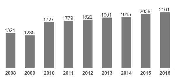 Número de trabajadores voluntarios en las organizaciones no lucrativas del país. Miles de personas, 2008-2016