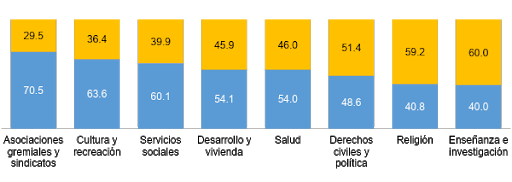 Así, en las organizaciones de enseñanza la participación es de 13.2%; en cambio, en las instituciones que proveen servicios sociales incluyendo a los albergues, asilos o las casas hogar el trabajo voluntario representa el 87 por ciento de los trabajadores que hacen posible su funcionamiento.