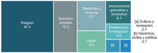Las actividades a las que apoyan los trabajadores voluntarios en una mayor medida son aquellas que se desarrollan en las organizaciones religiosas, con el 40.4% del total.
