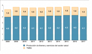 En 2017 el Producto Interno Bruto Ampliado (PIBA) del sector salud fue equivalente a 1 millón 229 mil 703 millones de pesos, lo que significó el 5.6% del PIB del país (a precios de mercado). A su interior, este sector se conformó del valor producido por los bienes y servicios finales relacionados con la prevención, cuidado y mantenimiento de la salud humana, que aportó el 4.1% del PIB total, así como del valor del trabajo no remunerado encaminado al cuidado de la salud (TNRS) que contribuyó con el 1.5% restante (ver gráfico siguiente).