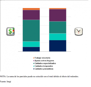 Bajo este enfoque, si los hogares hubieran contratado durante el 2017 a una persona para cuidar a sus enfermos, de cada 100 pesos que erogarían para este fin, cerca de 50 pesos se destinarían para la atención de aquellos miembros del hogar que presentan alguna discapacidad o enfermedad crónica; 23 pesos para proveer asistencia en salud a los integrantes de manera preventiva o cuyo padecimiento es temporal (gripa, tos, dolor de cabeza, etc.), y los pesos restantes se destinarían como ayuda a otros hogares y/o trabajo voluntario en organizaciones sin fines de lucro relacionadas con la salud.
