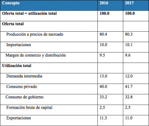 Por el lado de la utilización, el consumo privado concentró el 41.7% de la oferta total, el consumo de gobierno lo hizo con el 32.8%, la demanda de bienes y servicios para la producción (demanda intermedia) en 12%, a las exportaciones se destinó 11% y para la formación bruta de capital se utilizó el 2.5 por ciento.