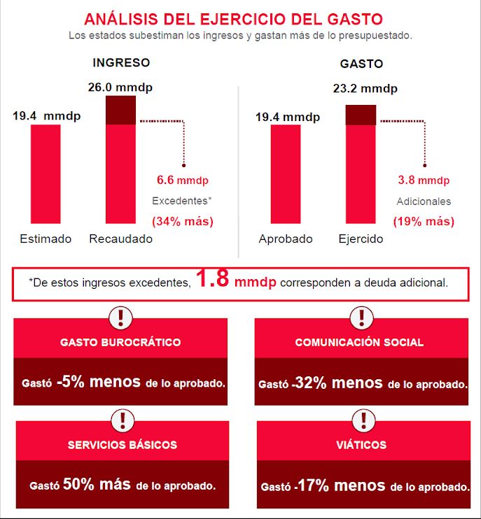 De acuerdo con el análisis, el cumplimiento a los presupuestos de egresos de las entidades federativas es un acto de simulación y discrecionalidad. Las entidades subestiman sus ingresos, gastan más de lo presupuestado y se endeudan por arriba de lo planeado. La falta de acción por parte de los congresos locales es una muestra de que no son un contrapeso real para los gobernadores y sus secretarías de finanzas.