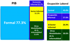Analizando en conjunto la contribución al PIB y el número de puestos de trabajo tanto del Sector Informal como del Empleo Informal en el Sector Formal, se tiene que en 2017, el Sector Informal contribuye al PIB con el 11.1%, ocupando el 27.0% del Empleo, en tanto que las Otras Modalidades de la Informalidad aportan el 11.6% al PIB y ocupa el 30.1% del Empleo.