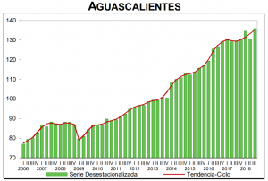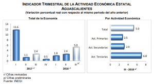 En el tercer trimestre de 2018, Aguascalientes obtuvo la segunda posición del total de la economía, con respecto a las 32 entidades federativas; asimismo, presentó una aportación de 0.07 puntos porcentuales al crecimiento nacional, ubicándose en el lugar décimo de contribución.