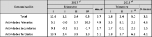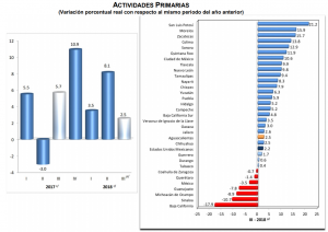 Las Actividades Primarias que incluyen la agricultura, cría y explotación de animales, aprovechamiento forestal, pesca y caza, reportaron un avance anual en el tercer trimestre de 2018 de 2.5%, ocasionado, sobre todo, por el comportamiento de la cría y explotación de animales. Debido a esto, la entidad se ubicó en el lugar 21 en lo nacional.