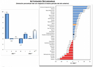 minería, manufacturas, construcción y electricidad, que en su conjunto reflejaron un aumento anual de 2.9% en el tercer trimestre de 2018, debido, sobre todo, al comportamiento registrado en las industrias manufactureras; en la generación, transmisión y distribución de energía eléctrica, suministro de agua y de gas por ductos al consumidor final; y en la construcción.  Lo anterior, motivó para que el estado se situara, en este rubro, en la posición 12 del total de las entidades.