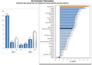 Las Actividades Terciarias conciernen a los sectores dedicados a la distribución de bienes y aquellas actividades vinculadas con operaciones de información y de activos, así como con servicios afines al conocimiento y experiencia personal; además, de los relacionados con la recreación y con la parte gubernamental, entre otros.  La entidad en estas actividades mostró una variación anual de 6.8% en el tercer trimestre de 2018, motivado, en especial, por el comercio; por los servicios financieros y de seguros; por las actividades legislativas, gubernamentales y de impartición de justicia; por los servicios inmobiliarios y de alquiler de bienes muebles e intangibles; y por los servicios de alojamiento temporal y de preparación de alimentos y bebidas.  Derivado de este escenario, la entidad se ubicó en el primer lugar de crecimiento.