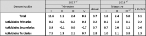 El acumulado enero-septiembre creció 3.1%, reflejo del ascenso en las Actividades Primarias, Secundarias y Terciarias de 4.6, 1.5 y 4.1%, correspondientemente.