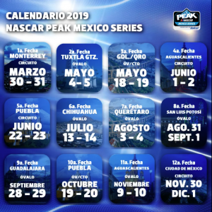 Nascar Peak México dio a conocer el calendario de la temporada 2019, el domingo 31 de marzo será la cuadrícula para el inicio de la temporada en Monterrey, en lo referente al Óvalo Aguascalientes tendrá dos fechas, la primera el 2 de junio con modalidad de circuito y en formato óvalo el 10 de noviembre, a continuación el calendario completo, quedando sujeto a modificaciones.