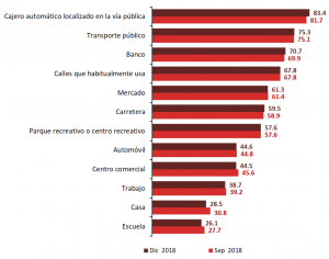 En lo referente a la percepción de inseguridad en espacios físicos específicos, en diciembre de 2018, 83.4% de la población manifestó sentirse insegura en los cajeros automáticos localizados en la vía pública, 75.3% en el transporte público, 70.7% en el banco y 67.8% en las calles que habitualmente usa.