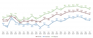 En el ámbito nacional, este porcentaje representa un cambio significativo respecto a septiembre de 2018 y con respecto a diciembre 2017. La percepción de inseguridad siguió siendo mayor en el caso de las mujeres con 78%, mientras que para los hombres fue de 68.6 por ciento.