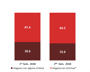 Durante el segundo semestre de 2018 se estima que 35.8% de los hogares en zonas urbanas tuvieron integrantes que fueron víctima1 de al menos un delito de robo total2 o parcial3 de vehículo, robo en casa habitación, robo o asalto en calle o transporte público (incluye robo en banco o cajero automático), robo en forma distinta a las anteriores, o extorsión.