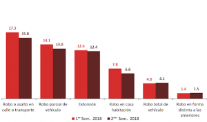 Durante el segundo semestre de 2018, en 15.8% de los hogares de las ciudades de interés, al menos un integrante del hogar sufrió Robo o asalto en la calle o en el transporte público. Por otra parte, 13% de los hogares fue víctima de robo parcial de vehículo, y en 12.4% de los hogares al menos un integrante del hogar sufrió Extorsión.