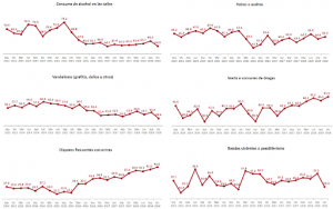 Los resultados del vigésimo segundo levantamiento de la ENSU revelan que, durante el cuarto trimestre de 2018, el porcentaje de la población que mencionó haber visto o escuchado conductas delictivas o antisociales en los alrededores de su vivienda fue: consumo de alcohol en las calles (64.8%), robos o asaltos (65.2%), vandalismo en las viviendas o negocios (49.6%), venta o consumo de drogas (45.6%), disparos frecuentes con armas (42.8%) y bandas violentas o pandillerismo (33.3 por ciento).