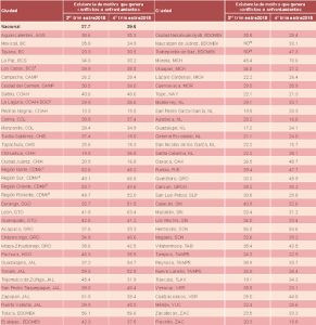 Las ciudades con mayor porcentaje de personas de 18 años y más que consideraron que vivir en su ciudad es inseguro fueron: Reynosa, Chilpancingo de los Bravo, Puebla de Zaragoza, Coatzacoalcos, Ecatepec de Morelos y Villahermosa, con 96, 93.8, 93.4, 93.4, 93.4 y 92.3%, respectivamente.