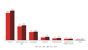 Respecto al cuarto trimestre de 2017, se presentó un aumento de 1.7 puntos porcentuales en cuanto a la atestiguación de robos o asaltos; 2.7 puntos porcentuales en cuanto a venta o consumo de drogas; 5 puntos porcentuales respecto a disparos frecuentes; una disminución de 2.8 en vandalismo; y 1.9 puntos porcentuales respecto a bandas violentas o pandillerismo. Con respecto al tercer trimestre de 2018 se presentó una disminución de 1.8 puntos porcentuales en consumo de alcohol en las calles; 3.8 puntos porcentuales en vandalismo; 3.8 en bandas violentas o pandillerismo; y un aumento en disparos frecuentes de 1.8 por ciento.