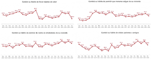 61.4% de la población de 18 años y más, residente en las ciudades objeto de estudio, manifestó que durante el cuarto trimestre de 2018 modificó sus hábitos respecto a “llevar cosas de valor como joyas, dinero o tarjetas de crédito” por temor a sufrir algún delito; mientras que 56.2% reconoció haber cambiado hábitos respecto a “permitir que sus hijos menores salgan de su vivienda”; 53.2% cambió rutinas en cuanto a “caminar por los alrededores de su vivienda, pasadas las ocho de la noche” y 34.6% cambió rutinas relacionadas con “visitar parientes o amigos”. Con respecto al tercer trimestre de 2018 se tiene un descenso estadísticamente significativo de 4.4 respecto a cambio de hábitos como llevar cosas de valor, de 2.6 puntos porcentuales respecto a caminar por los alrededores de su vivienda, de 3.6 puntos porcentuales respecto a visitar parientes y de 4.9 respecto a permitir que menores salgan de su vivienda.