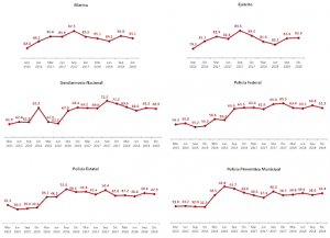Entre los resultados de la ENSU, correspondientes a diciembre de 2018, destaca que los porcentajes de población de 18 años y más que identificó a las diversas corporaciones policiales y que percibió su desempeño como “muy o algo efectivo” en sus labores para prevenir y combatir la delincuencia fueron: Marina (85.1%), Ejército (82.6%), Gendarmería Nacional (68.9%), Policía Federal (63.3%), Policía Estatal (47.9%), y Policía Preventiva Municipal (39.4 por ciento).