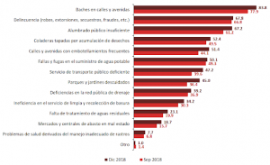 83.8% de la población de 18 años y más manifestó como uno de los problemas más importantes en su ciudad la existencia de “baches en calles y avenidas”; 67.8% la “delincuencia (robos, extorsiones, secuestros, fraudes, etc.)”, y 67.2% consideró el “alumbrado público insuficiente”.