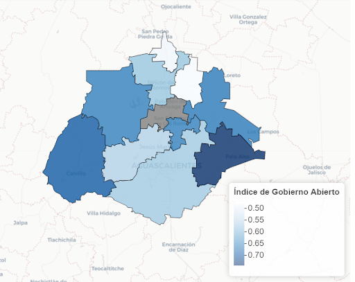 Diez de los once municipios de la entidad fueron incluidos en este estudio, sólo no se consideró a Pabellón de Arteaga. El municipio con el Índice de Gobierno Abierto más alto fue El Llano, incluso por arriba del índice estatal, con 0.74, seguido de Calvillo, con 0.70 y Asientos con 0.67. En el subíndice de transparencia Jesús María ocupa el primer lugar con 0.85, seguido de Asientos con 0.82 y El Llano con 0.80, mientras que en la dimensión de participación Calvillo está arriba en la lista con 0.70, seguido por El Llano, San Francisco de los Romo y San José de Gracia, los tres con 0.68