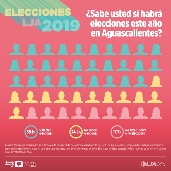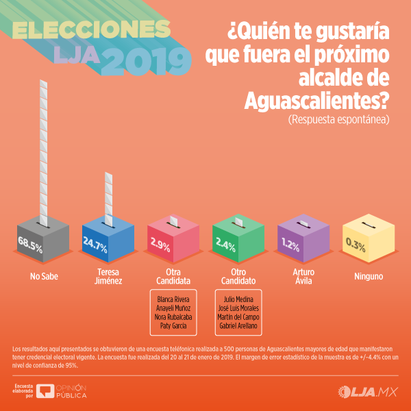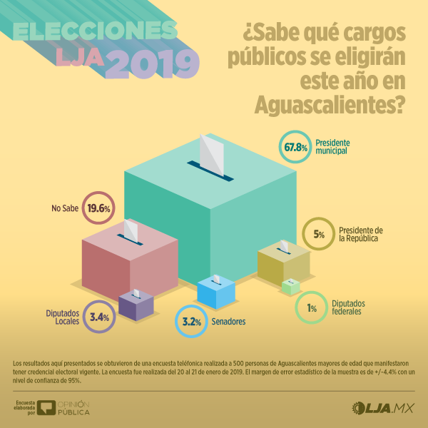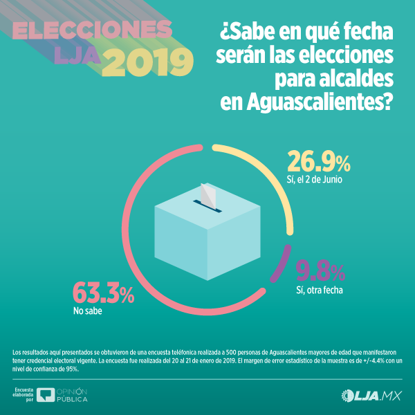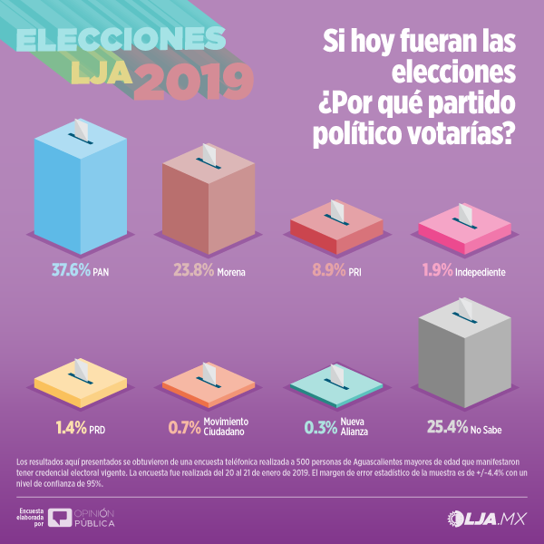 Metodología. Entre 20 y 21 de enero pasado, se levantaron 500 encuestas telefónicas con operadora desde un Call Center de Monterrey, entre hombres y mujeres mayores de 18 años con teléfono en sus hogares y los cuales dijeron tener su credencial de elector vigente en el municipio de Aguascalientes. El procedimiento de selección fue probabilístico, aleatorio, con base en el listado de teléfonos del municipio. El margen de error estadístico de la muestra es de +/- 4.4% con un nivel de confianza de 95%.