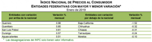 En el ámbito nacional, el Inegi informa que durante enero de 2019 el INPC registró un aumento mensual de 0.09 por ciento, así como una inflación anual de 4.37 por ciento. En el mismo periodo de 2018 las variaciones fueron de 0.53 por ciento mensual y de 5.55 por ciento anual.
