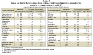 En el mismo periodo, en cuanto al Índice del Costo Unitario de la Mano de Obra, Aguascalientes tuvo una reducción de (-)2% en cuanto a industrias manufactureras con base en horas trabajadas; las empresas comerciales al por mayor con base en el personal ocupado presentaron índices a la baja de (-)19.7%, y las empresas comerciales al por menor tuvieron una decrecimiento de (-)3.6 en este rubro.