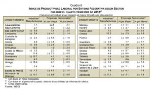 De acuerdo al Índice de Productividad Laboral según Sector, durante el cuarto trimestre de 2018 Aguascalientes registró, en comparación al mismo trimestre del año anterior, un aumento del 7.1% en industrias manufactureras con base en horas trabajadas, e incrementos de 22.8% en comercio al por mayor y 3.1% en comercio al por menor con base en el personal ocupado.