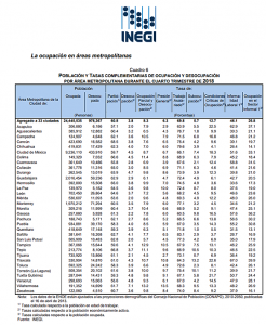 Por otra parte, las entidades que durante el cuarto trimestre de 2018 observaron las tasas de desocupación más altas fueron Tabasco con 7.9%; Ciudad de México, 5.1%; Durango, 4.1%; Tlaxcala, 4%; el Estado de México, Guanajuato y Tamaulipas con 3.8% cada una; Baja California Sur, Colima y Querétaro con 3.7%, y Coahuila de Zaragoza, Nayarit y Sonora con 3.6% con relación a la PEA. Aguascalientes presenta un 3.2% de desempleo.