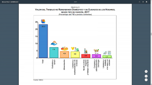 El Valor Económico del Trabajo No Remunerado de los Hogares (VTNRH) está compuesto por las labores domésticas y de cuidados (realizadas por los miembros del hogar mayores de doce años) que son equivalentes al 23.3% del PIB, las actividades destinadas a la generación de bienes de autoconsumo que se aportan genera otro 1.6% del producto.