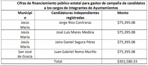 A fin de garantizar el principio de equidad en la contienda, el monto fue repartido de manera igualitaria entre las planillas que obtuvieron su registro, encabezadas por Jorge Ríos Contreras, José Luis Mares Medina, Jairo Daniel Segura Pérez y Juan Gabriel Romo Murillo, quienes cumplieron con diversos requisitos, entre ellos el de reunir la cantidad de firmas de apoyo ciudadano prevista en la legislación.