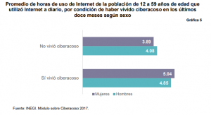 Se calculó el promedio de uso diario de Internet, y con ello se identificó que existe cierta relación entre el tiempo de uso y el vivir ciberacoso; la estimación muestra que tanto hombres como mujeres que vivieron alguna situación en los últimos doce meses, utiliza en promedio una hora más el Internet en comparación con la población que declaró no haber vivido ciberacoso, sobresale además una ligera mayor exposición de las mujeres en relación con los hombres.
