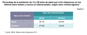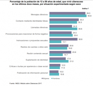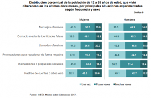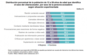Varias de las situaciones de acoso cibernético presentan un porcentaje similar en la distinción por sexo, a excepción de cuatro situaciones, dos de ellas muy específicas en que las mujeres son claramente más expuestas a sufrirlas, las del acoso sexual y que reflejan una diferencia significativa comparada con los hombres, insinuaciones o propuestas sexuales con 30.8% de las mujeres que lo ha vivido en el último año, contra 13.1% de los hombres; y recibir fotos o videos de contenido sexual con un 23.9% versus 14.7%. Mientras que las dos situaciones más experimentadas por los hombres, en relación con lo declarado por las mujeres, son recibir llamadas ofensivas y la suplantación de identidad.