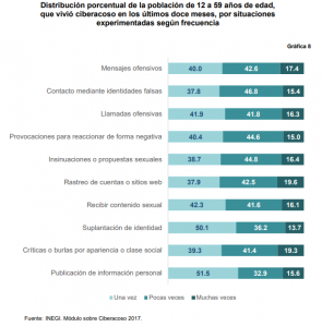 La prevalencia del ciberacoso está vinculada a varios tipos de situaciones claramente definidas en este estudio, mediante las cuales se actúa contra la víctima y representan parte de la caracterización que le pone rostro al fenómeno; se pudo establecer que las situaciones experimentadas con mayor frecuencia por la población que ha vivido ciberacoso fue recibir mensajes ofensivos (40.1%), cerca de un tercio fue contactada mediante identidades falsas (31.4%) y poco más de una cuarta parte recibió llamadas ofensivas (27.5 por ciento).