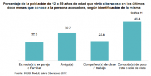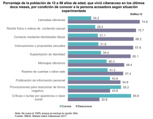 La identificación de la persona que realiza el ciberacoso, varía según la situación específica, hay acciones en las que el agresor se esconde más frecuentemente en el anonimato, como lo son: llamadas ofensivas, el envío de fotos o videos de contenido sexual, el contacto mediante identidad falsa y las insinuaciones o propuestas sexuales, situaciones en las que en más del 67% la víctima desconoce de quién proviene el hostigamiento. Por el contrario, las críticas o burlas por la apariencia o clase social, así como el ser provocado para reaccionar de forma negativa, son situaciones que en más alto porcentaje se logra identificar el sexo de la persona agresora.