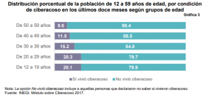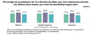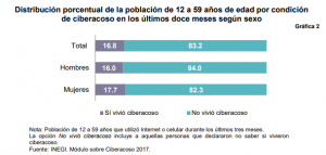 De la población usuaria de Internet, 16.8% declaró haber vivido, en los últimos doce meses, alguna situación de acoso cibernético por las que se indagó. La prevalencia por sexo es diferencial, siendo ligeramente mayor para las mujeres con 17.7%, mientras los hombres que se vieron afectados fueron el 16.0% por ciento.