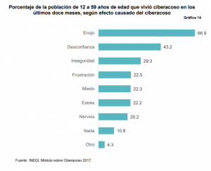 El fenómeno del ciberacoso es relativamente reciente y los estudios existentes generalmente se enfocan al ámbito escolar, por ende, se sabe poco sobre las consecuencias que conlleva y que provoca en las personas en general, fuera del ámbito escolar. Hay evidencia dentro de lo investigado, indicando que el ciberacoso puede ocasionar efectos muy graves como, impactos en su salud física y emocional e incluso hay casos que llegan al suicidio. En el Mociba se indagó por las diferentes reacciones y sentimientos que el fenómeno ocasiona en quienes lo han vivido en el último año, encontrando que los efectos que ocasiona son principalmente de enojo (66.9%), desconfianza (43.2%) e inseguridad (29.3%); y, de acuerdo a lo declarado solamente un 10.8% dijo no sentir afectación.