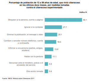 La población que experimenta ciberacoso puede tomar una postura ante el hecho. De acuerdo con los resultados se identifica que lo más frecuente es bloquear (a la persona, cuenta o página), seguida de ignorar o no contestar, eliminar la publicación, el mensaje o video y cambiar o cancelar número telefónico, cuenta o contraseña. Parece evidente que las personas afectadas deciden actuar por cuenta propia y eventualmente comentarlo con alguien de confianza, y en muy baja proporción realizan una denuncia ya sea ante ministerio público, policía o con el proveedor del servicio de Internet o telefonía celular.