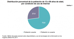 En México, el total de la población de doce a 59 años de edad estimada por la Endutih es de 84.5 millones de personas, de las cuales 51.6% son mujeres y 48.4% hombres. De ese total, se desprende que 61 millones 673 mil 310 personas en el país utilizaron Internet en cualquier dispositivo en los últimos tres meses, es decir, un porcentaje superior al 70%; ello da un panorama sobre el acercamiento de las personas al uso de las TIC por las ventajas que representa.