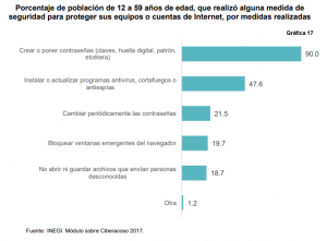 El Internet, en sus inicios, se utilizaba básicamente para buscar información y enviar/recibir mensajes por e-mail. Después comenzó a popularizarse el uso de redes sociales; lo que aumentó el riesgo de ataques cibernéticos para dañar equipos o mal uso de la información personal. La población que realiza medidas de seguridad para protegerse reportó como medida principal crear o poner contraseñas (claves, huella digital, patrón, etcétera) con un 90%, seguida por instalar o actualizar programas antivirus, cortafuegos o antiespías (47.6 por ciento).