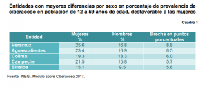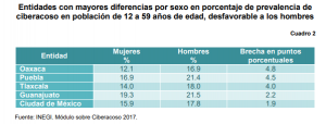 Analizando la prevalencia del ciberacoso en entidades, algunos casos llaman la atención por la brecha que se da por sexo; destaca que en Veracruz y Aguascalientes las mujeres lo reportan en 8.8 y 6.5 puntos porcentuales más que lo señalado por los hombres. En contraparte, para los hombres, sobresale Oaxaca en el que se tienen 4.8 puntos porcentuales más respecto de las mujeres. En varios estados no existe disparidad importante por sexo, como son Querétaro, Chihuahua, México, San Luis Potosí, Baja California Sur, donde la prevalencia de ciberacoso por sexo es prácticamente similar.